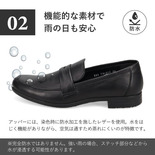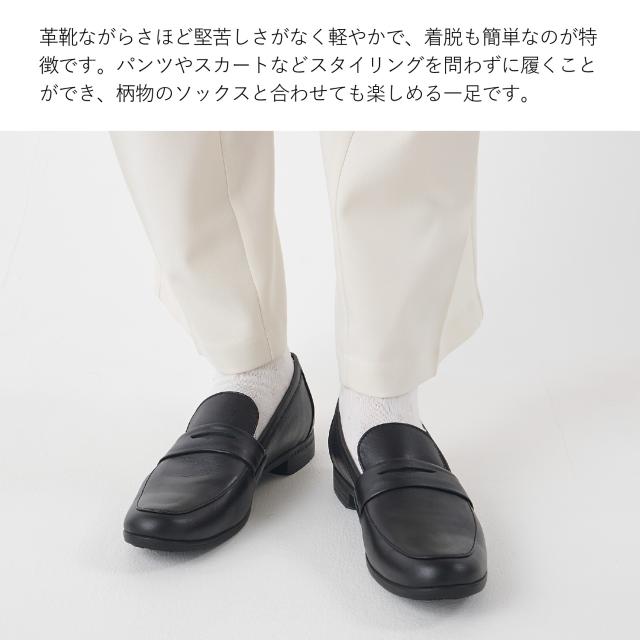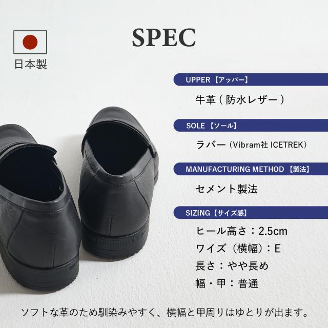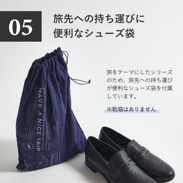 ローファーでありながら堅苦しくなく、軽やかな履き心地と着脱のしやすさが魅力です。パンツにもスカートにも合わせやすいデザインで、柄物の靴下でアクセントをつけるなど、さまざまなスタイルを楽しめます。「旅」をテーマにしたこのシリーズでは、持ち運びに便利なシューズ袋が付属しています。素材には、染色時にフッ素樹脂を繊維に絡ませ、表面にも防水加工を施したソフトな革を使用しています。水を弾きながらも通気性が保たれるため、蒸れにくいのが特徴です。※完全防水ではありません。強い雨の場合、ステッチなどから水が浸透する可能性があります。Shoelace:ゴム紐を使用しているため、紐を解かずに脱ぎ履きが可能です。Insole:低反発特殊ウレタンを使用しているため、歩行時の耐圧をゆっくりと包み込み衝撃を軽減します。Outsole:イタリアVibram社の中でグリップ性の高い配合であるICETREK(アイストレック)を採用しています。