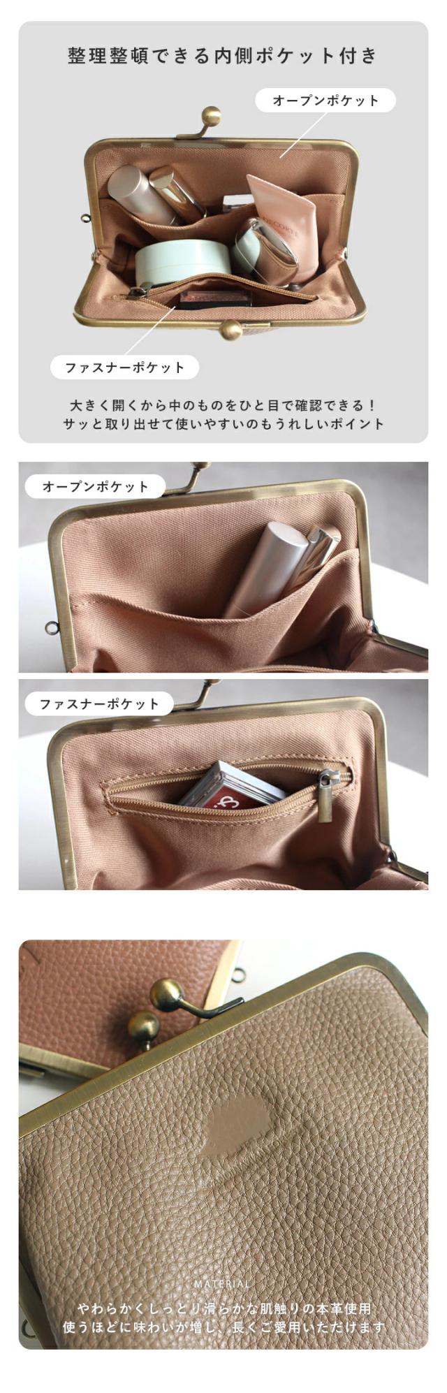 高級感のある本革の風合いと、がま口金具の サティーナゴールドがマッチしていていい感じに◎