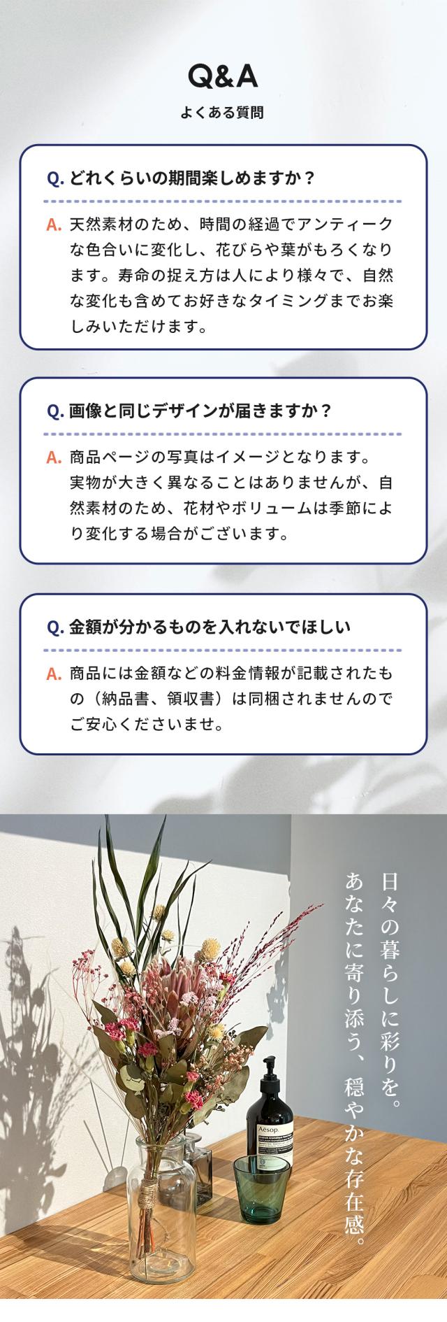 ・商品は細心の注意を払って梱包いたしますが、自然素材のため配送中に花や葉落ちが生じる場合がありますことをご了承ください。 ・天然素材を使用しておりますので、多少の個体差がございます。 ・モニターの発色により色が多少異なる場合がございます。 ・乾燥前の花や葉が、虫食いの状態で入荷することもございます。 目立つものは取り除いておりますが、生花の時の虫食いの跡であることをご了承ください。 ・ドライフラワーはとても繊細です。生花や造花と比べて丁寧に取り扱う必要がございますことを、ご了承の上お買い求めくださいませ。 |