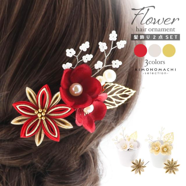 成人式 髪飾り Uピンの3点セット「アカ・シロ・ゴールド 梅につまみの菊」日本製 振袖用髪飾り お花髪飾り 成人式 卒業式 結婚式 着物【メール便不可】