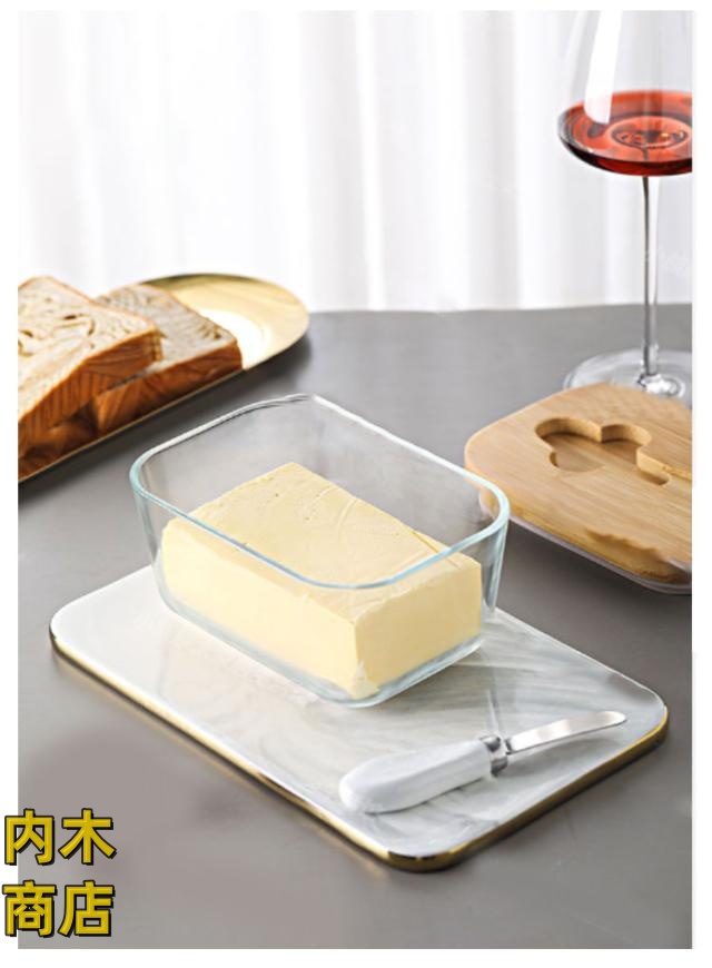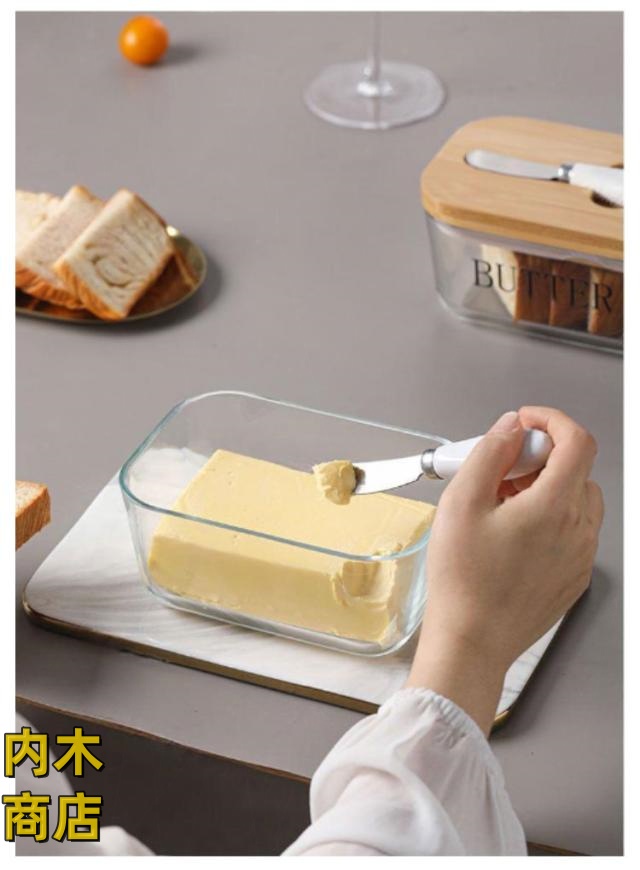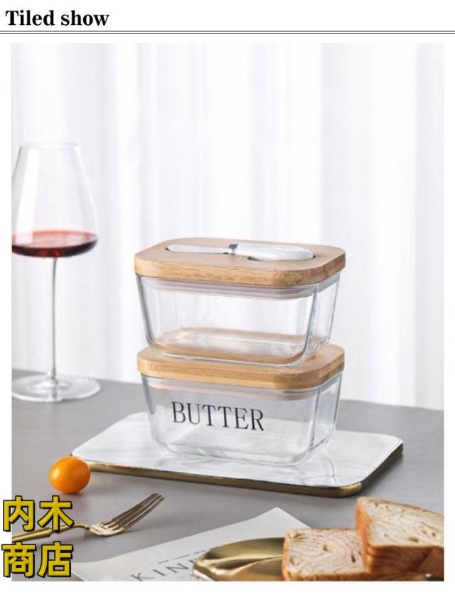 | ガラス製バターケース。【バターナイフ付】 木製蓋にはにおい移りや乾燥を防ぐパッキン付き 蓋に収納できるステンレスバターナイフ付き シンプルながらも洗練されたデザインと実用性を兼ね備えたバターケースです。 | |