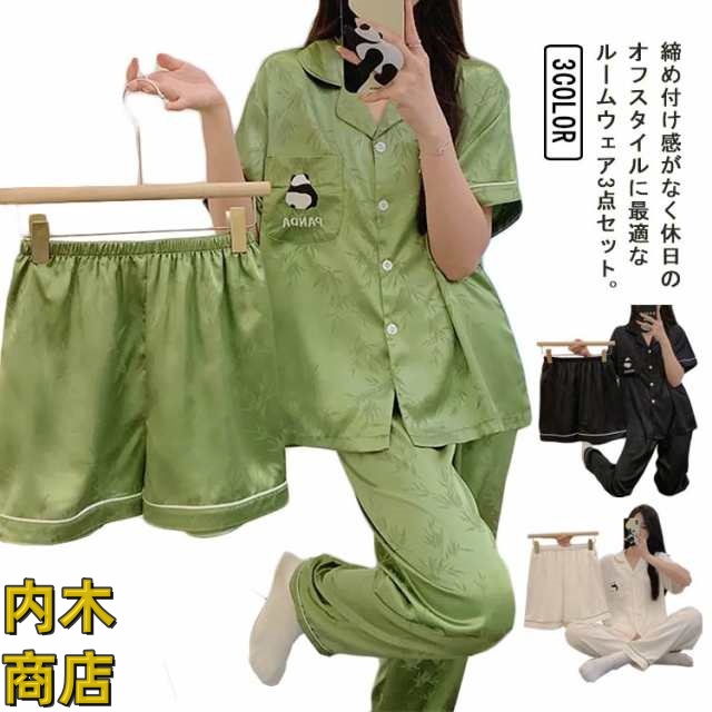 セットアップ パジャマ 3点セット 大きいサイズ 可愛い トップス ナイトウェア パンツ 前開き 長ズボン アイスシルク レディース 超かわいいパンダ柄!接触冷感 半袖 2 半ズボン お洒落 寝巻 ルームウェア