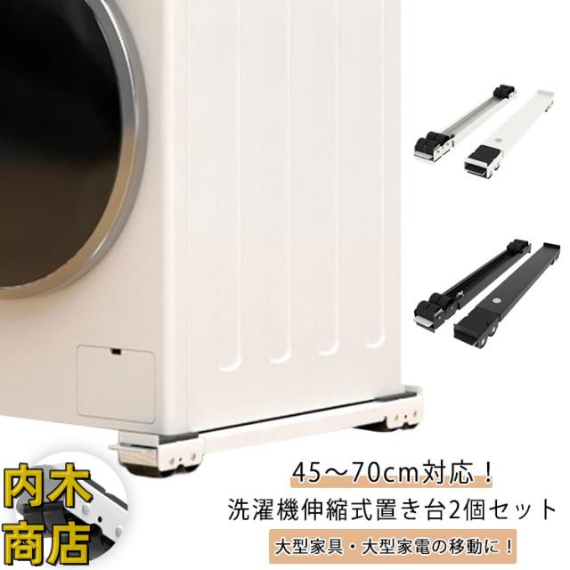 | 45?70cm対応!洗濯機伸縮式置き台2個セット。大型家具・大型家電の移動に! 【高品質素材】高品質なステンレス鋼を採用した洗濯機置き台は、非常に安定し、耐腐食性や錆止め性が抜群です。4連キャスターを搭載しており、300 kgの負荷に耐えられ、エアコン、ドラム式や全自動洗濯機、冷蔵庫、食器棚洗濯機、植木鉢、大型機器など、さまざまな家具に使用することができます。 【移動式・伸縮可能】この洗濯機置台は、16つのキャスターがついており、高さは4cmです、調整できません。この高さは安定性が高くて、掃除もやすくて、防水性も高いです。洗濯機や冷蔵庫などの大型家具にあわせて横幅45~70cmまで自由に伸縮可能です。また、洗濯機や冷蔵庫と床との接触を有効に防止できし、排水と清掃問題を簡単に解決します。水分による製品の錆びを防ぐこともでき、設備の寿命を延長することができます。 【騒音対策】この冷蔵庫台を組み立てるのは簡単です。ロックの設計を採用しており、一人で組み立てることができます。また、スリップを防止するために、洗濯機自体の安定や、洗濯や脱水中の騒音と振動を除去し、快適に使用することができる防振パッドを搭載されています。 【固定できるストッパー付】レバーを上下するワンタッチ式なので簡単に解除も固定もできます。 【簡単な長さ調整】お好みの長さに調整して、ネジで固定するだけの簡単セッティング。最大で70cmまで大きさに対応します。 | |