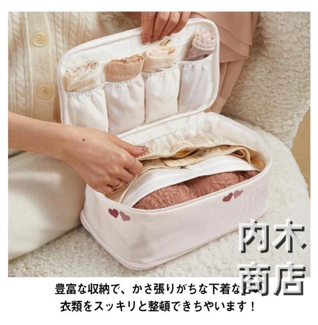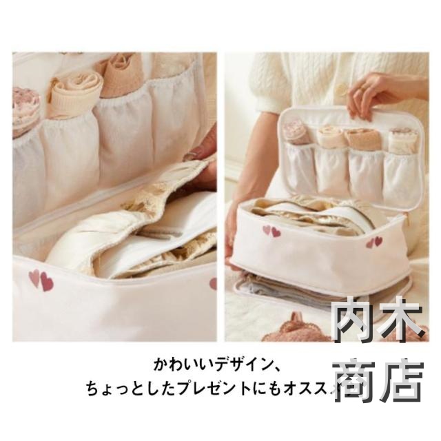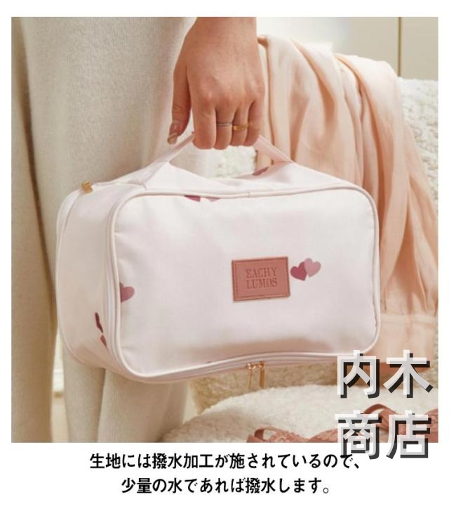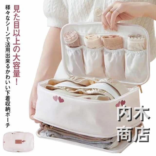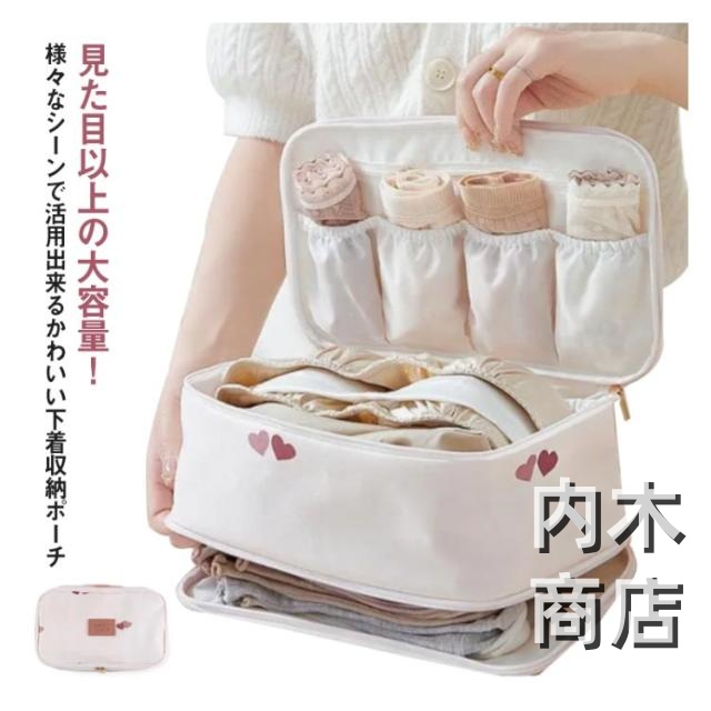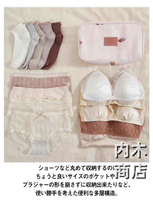| 見た目以上の大容量!様々なシーンで活用出来るかわいい下着収納ポーチ 豊富な収納で、かさ張りがちな下着などの衣類をスッキリと整頓できちやいます! ショーツなど丸めて収納するのにちょうと良いサイズのポケットや、プラジャーの形を崩さずに収納出来たりなど、使い勝手を考えた便利な多層構造。 生地には撥水加工が施されているので、少量の水であれば撥水します。 丸洗い可能でいつでも清潔! 旅行や出張などはもちろん、修学旅行や卒業旅行、ジムや温泉など幅広いシーンで利用可能です。 かわいいデザイン、ちょっとしたプレゼントにもオススメ♪ | |