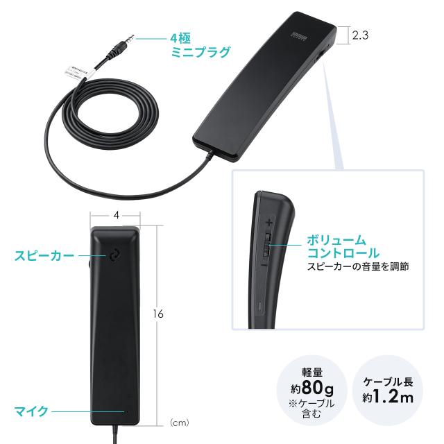 3.5mm4極ミニプラグに対応したイヤホン端子に接続するだけで使用できる、ハンドセットです。●形状は、ヘッドセットなどで頭への装着が苦手な方に最適な手になじむ受話器型です。