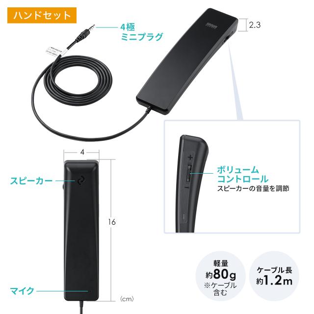 3.5mm4極ミニプラグに対応したイヤホン端子に接続するだけで使用できる、ハンドセットです。●専用スタンド(400-HS-STN2)とのセット品です。