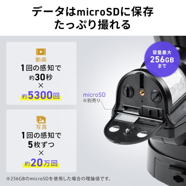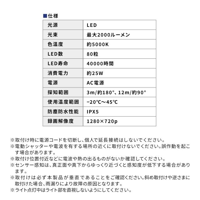 ⇒ご購入の前にご確認下さい人感センサーで感知し、自動点灯・自動録画するLEDライト付き防犯カメラ。最大約2000ルーメンの高輝度ライトで夜間も明るく照射、HD画質で録画可能。赤外線センサー搭載、防雨仕様、microSD最大256GB対応。【WEB限定商品】