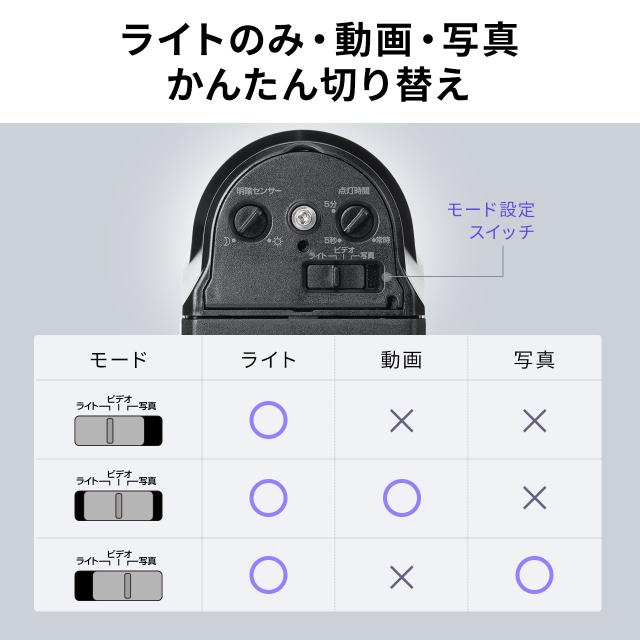 ●点灯モードは「昼夜で点灯」「夜のみ点灯」から選択でき、周囲の明るさに応じた運用が可能です。