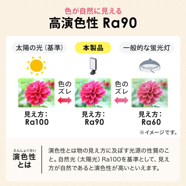 ●Ra90の高演色性LEDを採用しており、自然な色味で被写体を美しく照らします。