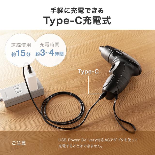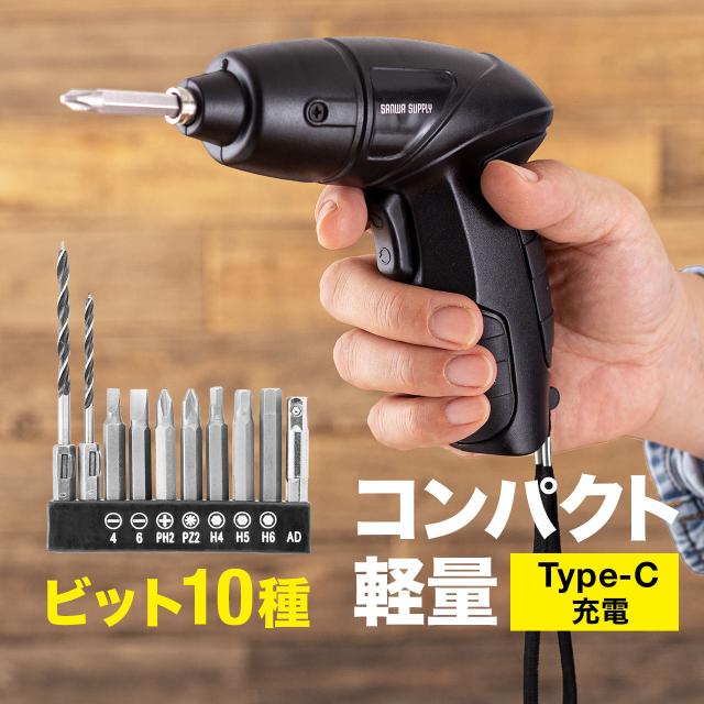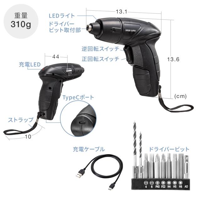 電動ドライバー USB Type-C 充電式 コンパクト ビット10種類 軽量 310g LEDライト付き ドリルドライバー 穴あけ 家具組立て コードレス 小型 ブラック[800-TK056]