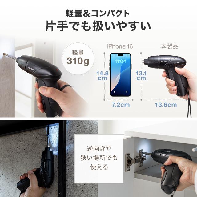 ●軽量×コンパクトで家具の組立てを手軽に行えるUSB Type-C充電式のコードレス電動ドライバーです。●スマホを持つような感覚で片手でも簡単に扱えるコンパクトで軽量な持ちやすい設計です。