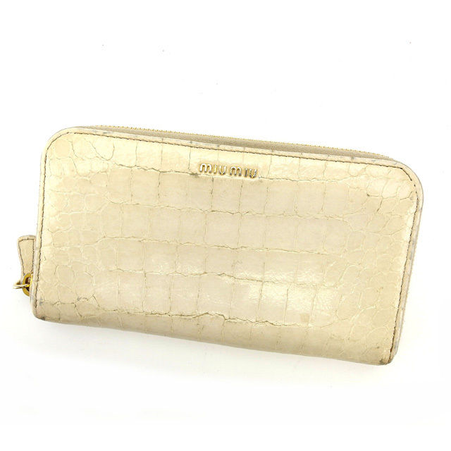 【ウィンターSALE★30%OFF】ミュウミュウ MIUMIU 長財布クロコダイル調 ライトベージュ×ゴールド レディース 中古