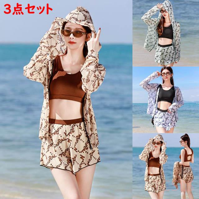 送料無料 水着 3点セット セパレート水着 柄水着 カバーアップ ビーチウェア ビキニ タンキニ 体型カバー 可愛い 大人 リゾート トレンド 3色/M-XL