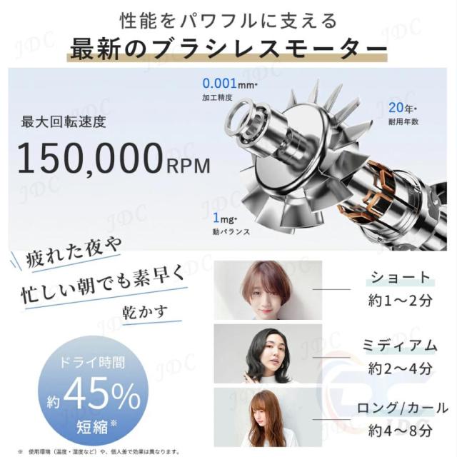 熱に頼らず“速乾力”に工夫を凝らして、従来の乾かし方を一新し、技術革新による新たな送風方法で、1400wの大風量と最大35m/s台風並みの大風速による、髪と頭皮を守りながら速乾を実現できるヘアドライヤー。