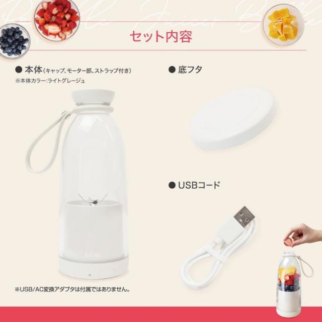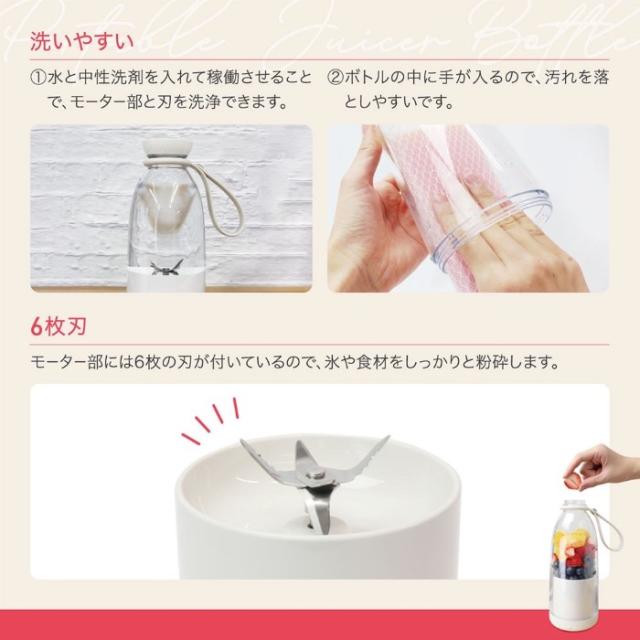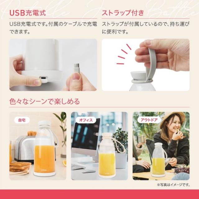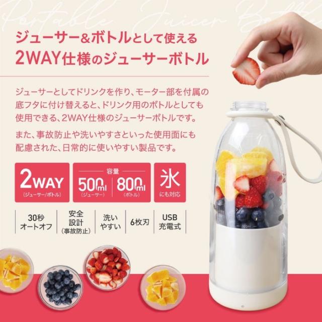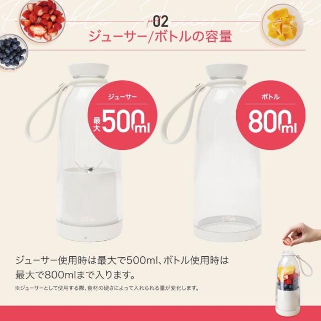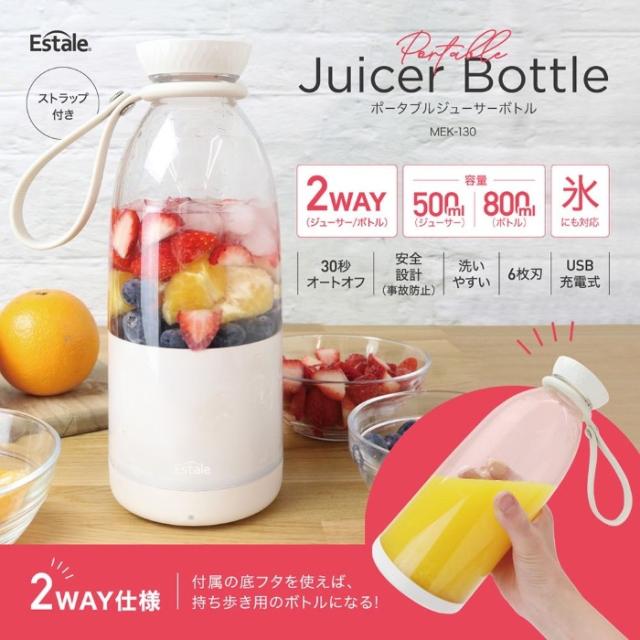 ジューサーとしてドリンクを作り、 モーター部を付属の底フタに付け替えるとドリンク用のボトルとしても使用できる、 2WAY仕様のジューサーボトルです。 ■種類:ジューサー・ミキサー ■定格容量:500ml(モーター部取り付け時)/800ml(底フタ取り付け時) ■寸法:約φ9.5×H23cm ■重量:約740g(ストラップ付き) ■原料樹脂:ボトル、モーター部:ABS樹脂/キャップ、底フタ:ポリカーボネート ■他材質:シリコン ステンレス ■電源:USB充電式(DC5V 2A) ■内蔵充電池:リチウムイオン電池 7.4V 2400mAh ■充電/稼働時間: 約3時間充電(満充電)、約10〜15回稼働(1回30秒) ※時間は使用環境(気温、食材の種類等)や使用期間によって異なりますのでご注意ください。 ■回転数:約16,000回/分(無負荷時) ■耐熱温度:ボトル:140℃/モーター部:60℃/キャップ:90℃/底フタ:110℃ ■品番:MEK-130 ■JAN:4532141153254 ※記載は商品仕様の一部です。仕様説明不足等の理由での返品はできません。特に適合等は必ずご確認ください。