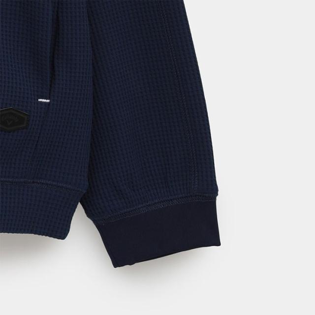 ワッフル素材のハーフジップシャツです。裾はダブル仕様になっており、カジュアルにボトムアウトで着用可能。半袖アイテムとの重ね着はもちろん、1枚でも着用できるため、1.5レイヤー的な使い方ができる汎用性の高いアイテムです。ハーフジップの開閉によって、衣服内の温度調整ができます。