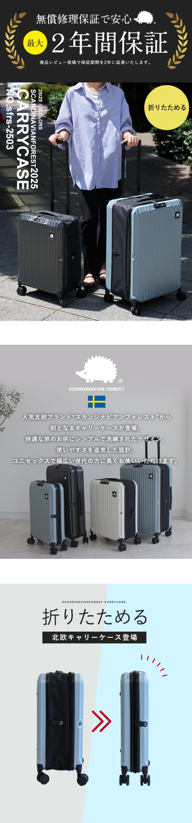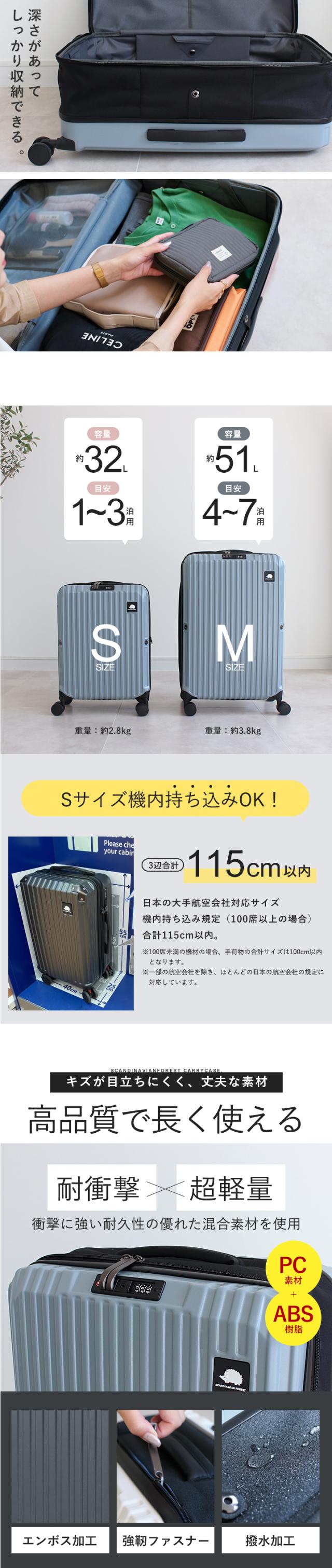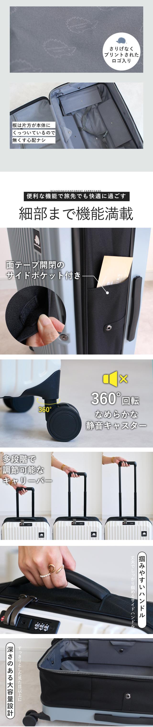 | 備考 | 人気北欧ブランド「SCANDINAVIAN FOREST」から初のスーツケースが登場しました。 傷が目立ちにくいエンボス加工が施された軽量で丈夫な素材を使用して、 可愛いハリネズミのロゴがアクセントになったシンプルなデザインは男女問わず幅広い世代におすすめです。 キャリーケースといえば使わないときの収納が悩み。 このキャリーケースは約半分に折りたためてスリムに収納できます。 TSAロック、調節可能なキャリーバー、360度回転のキャスターなど 使いやすいポイントも盛りだくさん。 Sサイズは機内持ち込み可能サイズです!(100席以上の場合) |