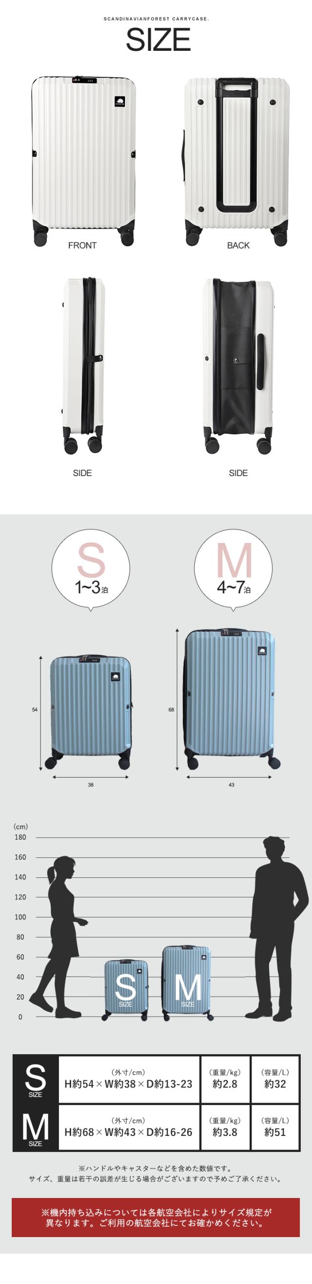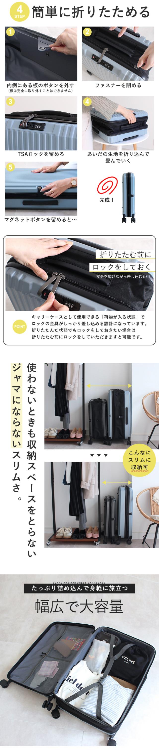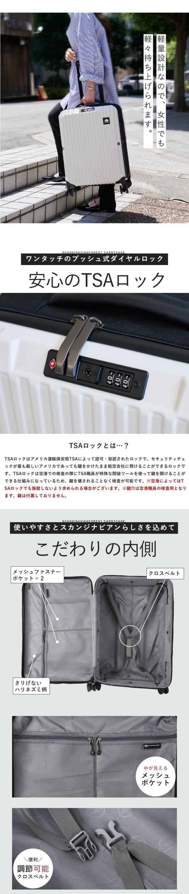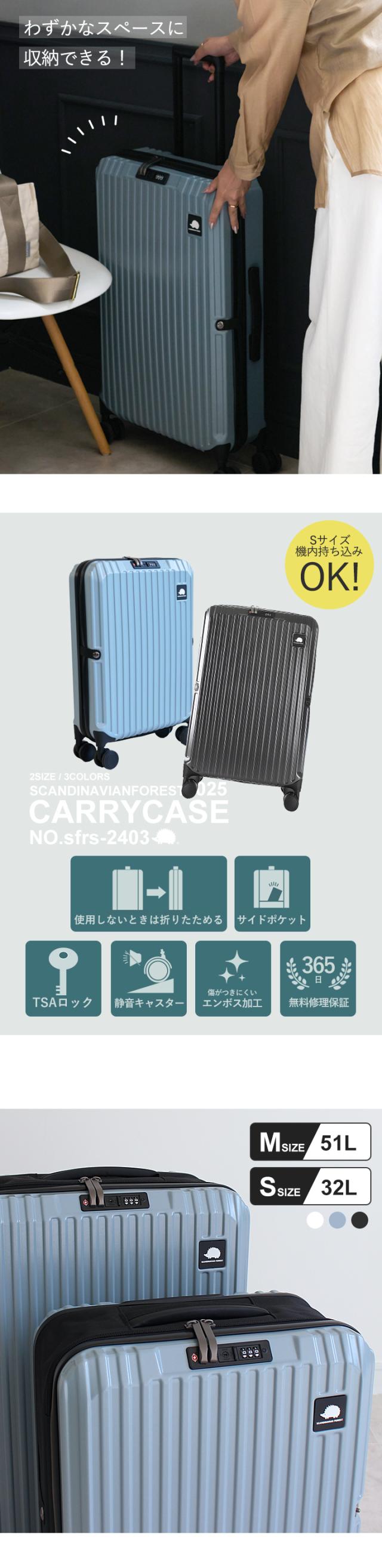 | 備考 | 人気北欧ブランド「SCANDINAVIAN FOREST」から初のスーツケースが登場しました。 傷が目立ちにくいエンボス加工が施された軽量で丈夫な素材を使用して、 可愛いハリネズミのロゴがアクセントになったシンプルなデザインは男女問わず幅広い世代におすすめです。 キャリーケースといえば使わないときの収納が悩み。 このキャリーケースは約半分に折りたためてスリムに収納できます。 TSAロック、調節可能なキャリーバー、360度回転のキャスターなど 使いやすいポイントも盛りだくさん。 Sサイズは機内持ち込み可能サイズです!(100席以上の場合) |
