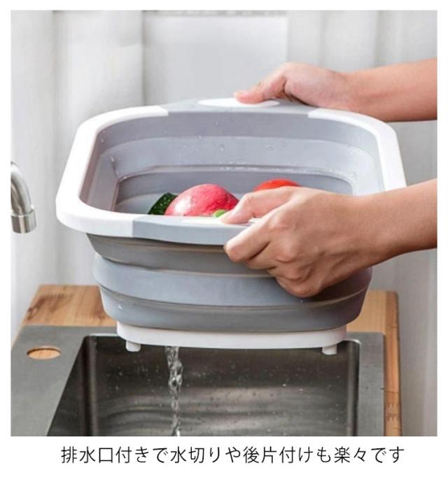 | 一人暮らしでも使えるサイズで洗い物も一気にできる折りたたみ排水バケツ シリコンとPPで出来ているので薄くて軽い!ラクラクお手入れで衛生的! 洗い物、野菜・果物を洗うときにとても楽な洗い桶になります 排水口付きで水切りや後片付けも楽々です 中の水を捨てるときもワンタッチでできるのでとても楽! まな板としてだけでなく、洗い桶も一緒になったアイテム キャンプやアウトドアでの食材の調理や、飲み物を冷やしたり、様々なシーンで活躍すること間違いなし! | |