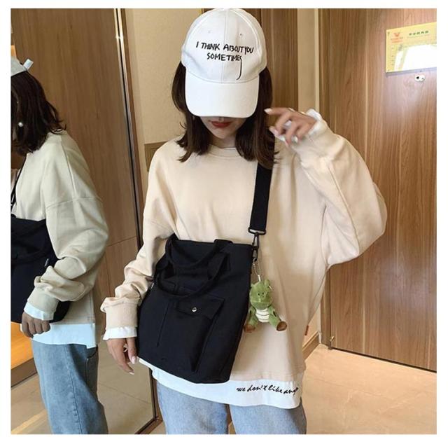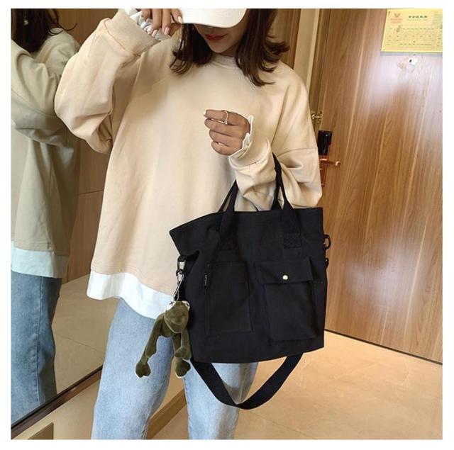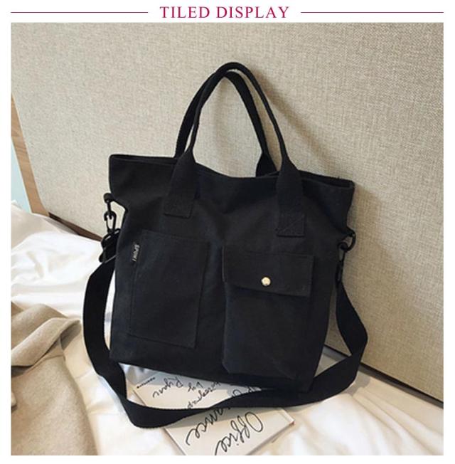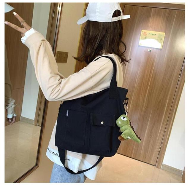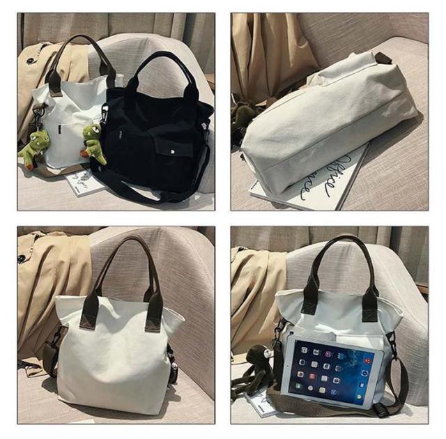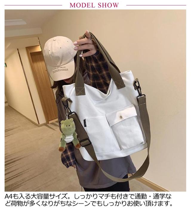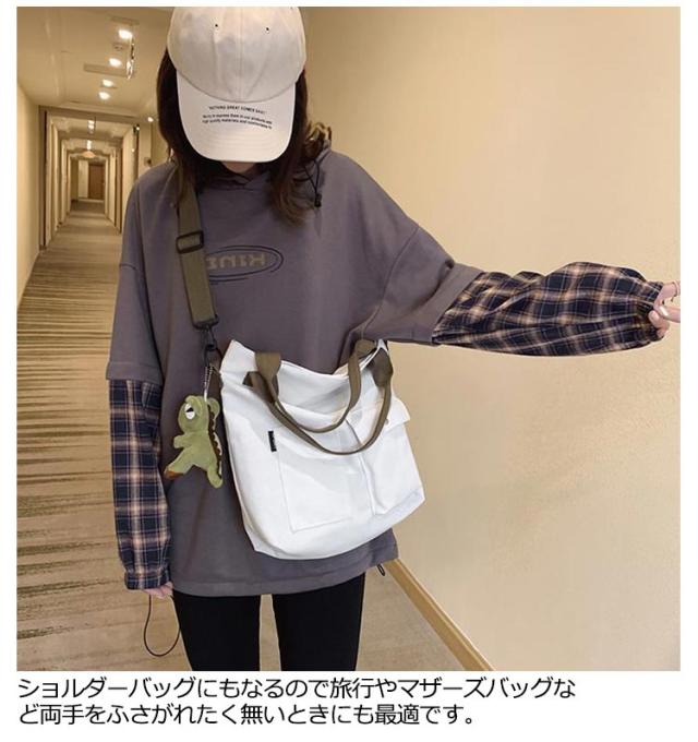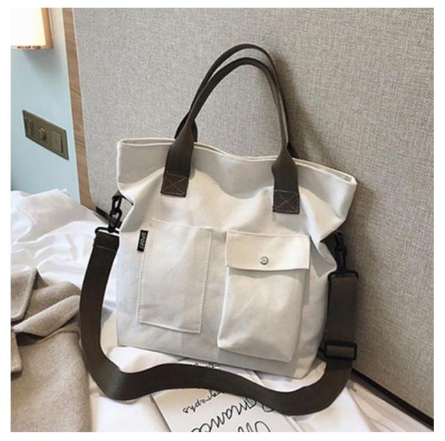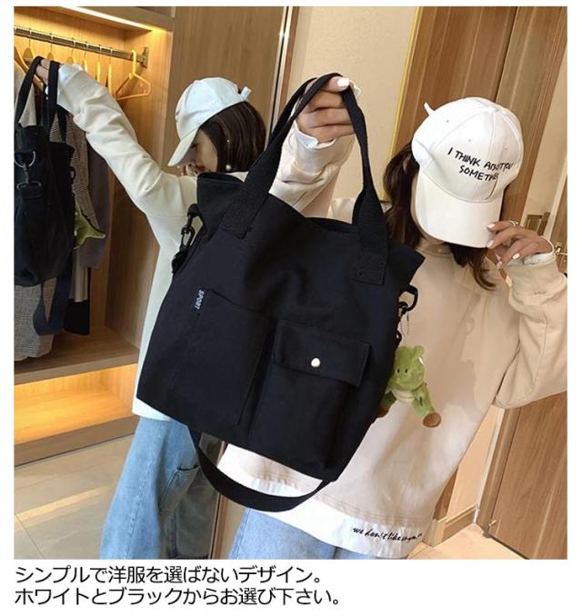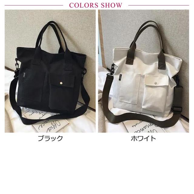 | 大きなポケットが付いた大容量トートバッグ! ショルダーバッグにもなるので旅行やマザーズバッグなど両手をふさがれたく無いときにも最適です。 A4も入る大容量サイズ。しっかりマチも付きで通勤・通学など荷物が多くなりがちなシーンでもしっかりお使い頂けます。 ポケット付きでティッシュや携帯など必要な物もすぐに取り出せます。マザーズバッグにも最適! シンプルで洋服を選ばないデザイン。ホワイトとブラックからお選び下さい。 | |