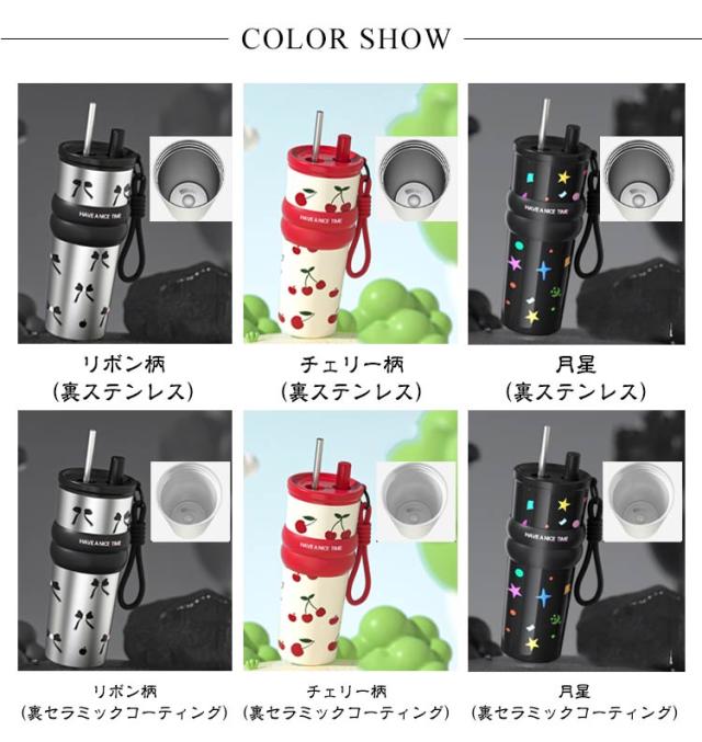 セラミック マグボトル ストロー付きタンブラー こぼれない ステンレス 水筒 真空断熱 蓋付き 710ml大容量 タンブラー ストロー付きタンブラー 手提げストラップ付き マイボトル マグカップ 保冷 伸縮ストロー ガーリー コーヒーカップ 漏れ防止 オフィス