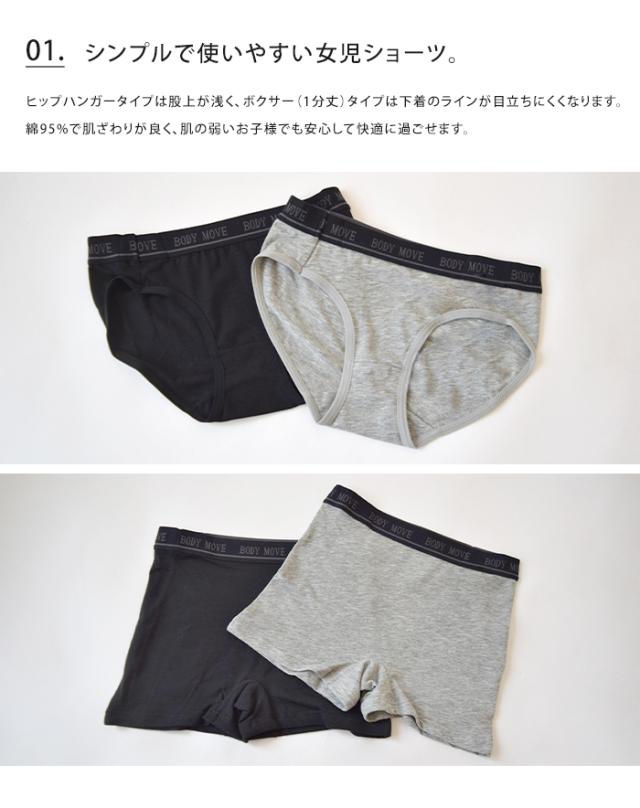 2タイプから選べる女の子用ショーツ。ヒップハンガータイプは股上が浅く、ボクサー(1分丈)タイプは下着のラインが目立ちにくくなります。綿95%で肌ざわりが良く、肌の弱いお子様でも安心して快適に過ごせます。締め付け感もなく、学校や日常使いにおすすめ。