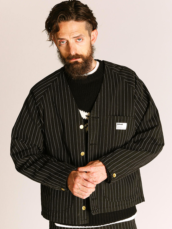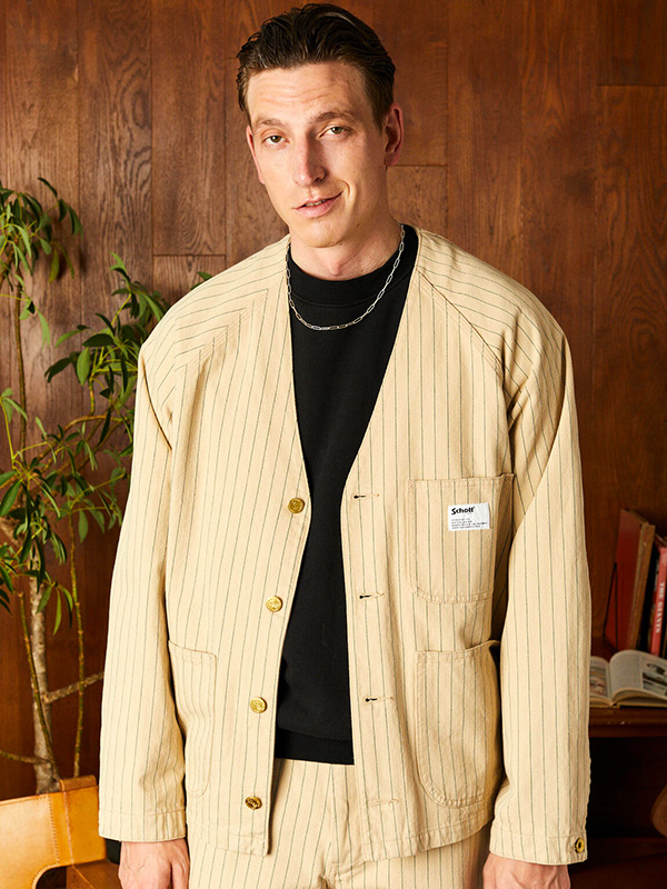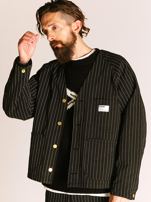Schott STRIPE ENGINEER JACKET ショット ストライプ エンジニア ジャケット 【Schott(ショット)】 ライダースジャケットの代名詞ともいえるSchottの歴史は、1913年、ニューヨークでアーヴィン・ショットジャックショットの兄弟によって始まった。 当初はレインコートを作る工場だったが、1928年に世界で初めてフロントジッパーを採用したライダースジャケット「Perfecto」シリーズを発売。 ボタン仕様しかなかった当時、画期的なジャケットとして話題となり、その後のライダース史に大きな影響を与えた。 そして、Schottの名を世界に知らしめたのが50年代に発表された星型のスタッズをエポレットに配した伝説のモデル”ワンスター“だ。 この新作こそが、映画『ザ・ワイルド・ワン(邦題「乱暴者」』で、マーロン・ブランドが纏ったと言われているモデルである。 その後もラモーンズやセックスピストルズをはじめ、多くのロックミュージシャンに支持され、時代を超えた永遠の番として今なお多くの人々を魅了する。 最近では定番モデルだけでなく、カジュアルラインも充実させるなど、常に時代に合わせて進化を遂げる革新性も忘れない。ライダースの歴史は永遠にSchottとともにある。 コットン100%のストライプヘリンボーン生地を採用し、程よいハリと味わい深い表情が特徴の一着。 エンジニアジャケットをベースに、現代的なシルエットへとリサイズし、洗練されたデザインに仕上げました。 フロントのVゾーンは程よい開き方で、無骨さと上品さを兼ね備えた印象に。 ボタンには真鍮製のオリジナルチェンジボタンを使用し、経年変化による風合いも楽しめます。 さらに、袖口にはサイズ調整ボタンを配置し、3本針縫製(トリプルステッチ)による堅牢な作りで、タフな着用にも対応。 クラシックなワークウェアのディテールを活かしながら、現代のスタイルに馴染む一着です。 | ||||||||||||||||||||