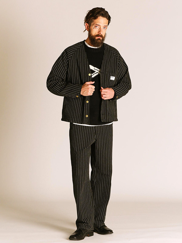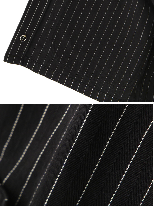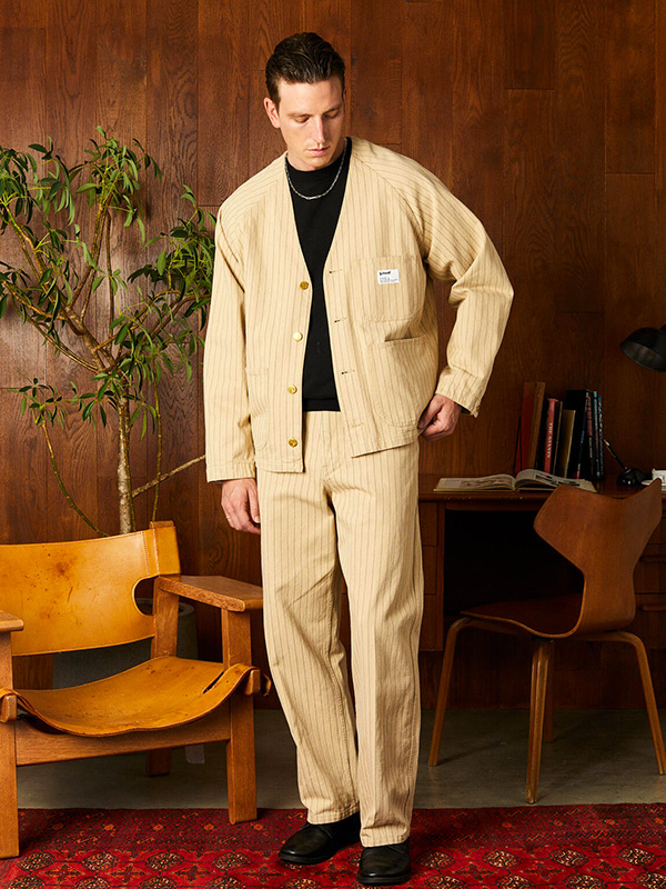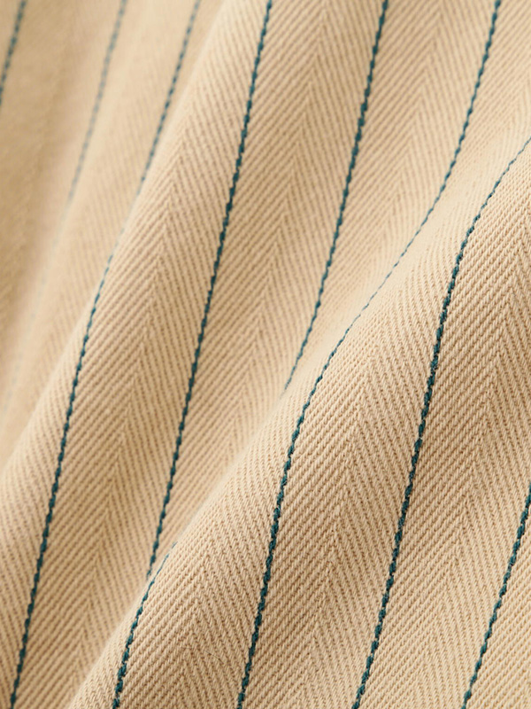 コットン100%のストライプヘリンボーン生地を採用し、程よいハリと味わい深い表情が特徴の一着。