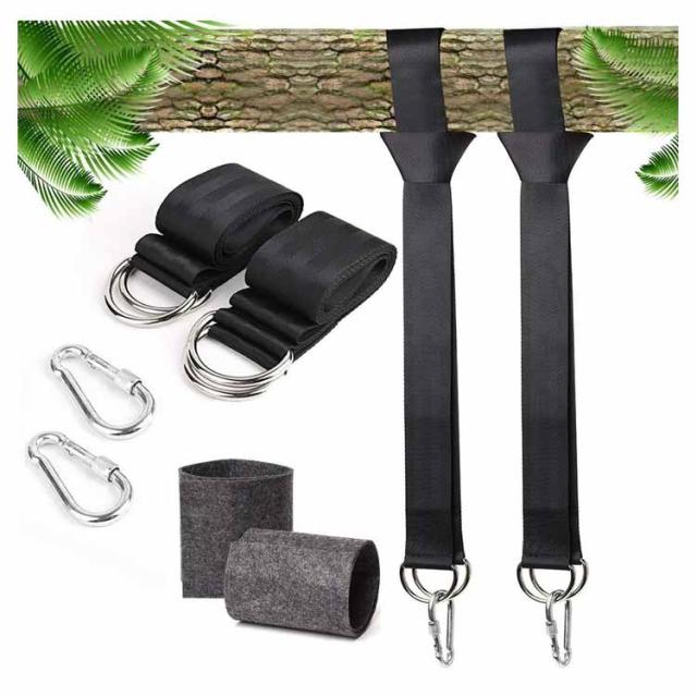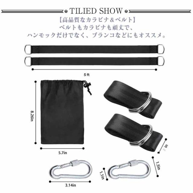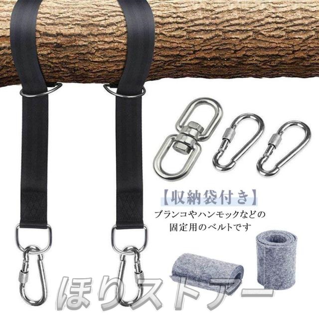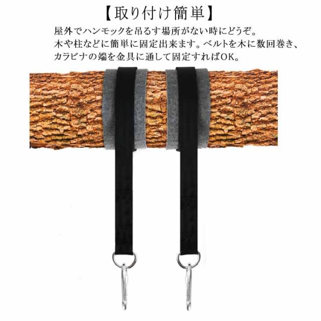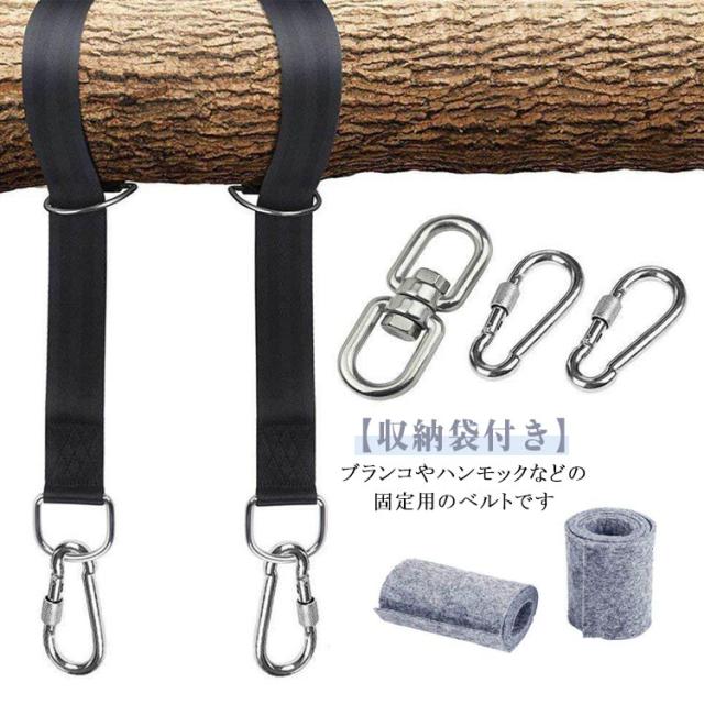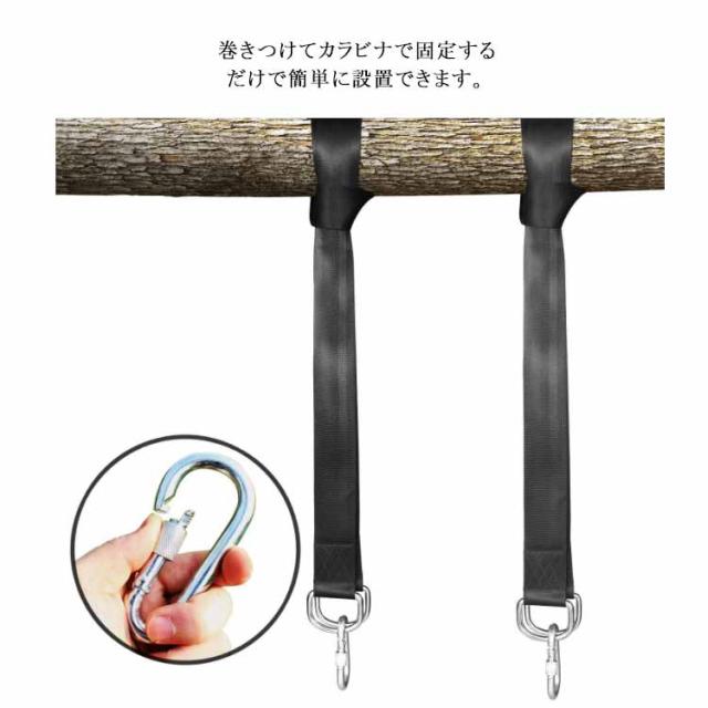 キャンプ 耐摩耗 ハンモック固定用ベルト 吊り下げベルト ブラック ツリーストラップ ハンモックベルト カラビナ2個 ハンモック固定用ベルト ロープ ブランコ用ベルト 長さ120cm/150cm/200cm 幅5cm アウトドア用品 庭 ベランダ リラックス