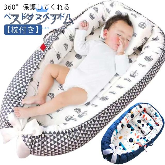 | 持ち運びやすいベッドインベッド。【枕付き】 赤ちゃんを寝かせておく、クーファンとしてはもちろん、お昼寝マット、プレイマットに使える添い寝ベッド! 新生児?寝返りをうつ前までのお子様にお使いいただけます。 お出かけ先での休憩に、リビングなどでのおひるねにも使えます。 ママのお腹の中のように、囲まれた空間設計をしました。 くるまれる安心感で赤ちゃんは安らぎ、睡眠をとることができます。 クッションのような素材柔らかくて衛生で、それに通気性が高いので、赤ちゃんの健康にいいです。 カバーは敏感な赤ちゃんの肌に直接触れるコットンを使用。ふんわりとした風合いで、お肌に優しい生地です。 ベビーがスリーピングする時、枕はベビーをたっぷりと眠らせます。 布団がおくるみとしてもお使い頂けます。また、ベビーが遊んでいる時、この枕を取り外してもいいです。 360°保護してくれるベッドインベッド! | |