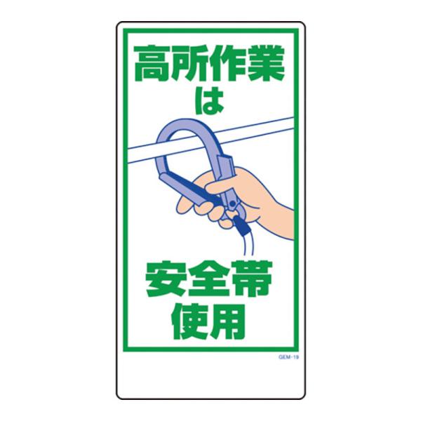 マンガ標識 PP 1mm 300×600 角R 四隅穴 工事看板 工事用看板 標識 看板 安全用品 保安用品 GEM-19 高所作業は安全帯使用
