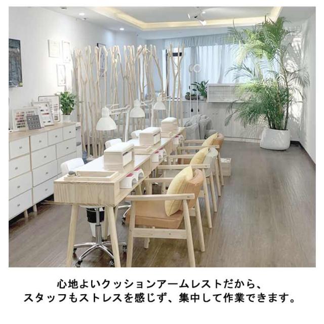 | お客様が施術中疲れない設計のアームレスト。 心地よいクッションアームレストだから、スタッフもストレスを感じず、集中して作業できます。 ライトが収まる設計です。使いやすさにこだわり作りました。 防水加工がされているので濡れても安心、さっと一拭きでOK! また、適度な弾力のあるマットレスですので、腕を快適に乗せれます。 汚れにも強く、サイズ感もちょうどいいためサロンワークで大活躍! | |