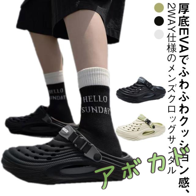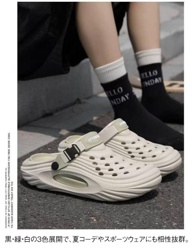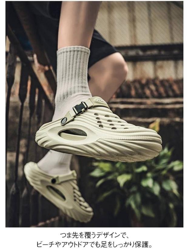 | 厚底EVAでふわふわクッション感、2WAY仕様のメンズクロッグサンダル 防滑設計と通気性で、夏のビーチから街歩きまで快適 つま先を覆うデザインで、ビーチやアウトドアでも足をしっかり保護。 2WAYデザインでサンダルにもスリッパにも変身、シーンに合わせて履き替え可能。 軽量かつ防滑ソール採用で、濡れた路面や砂浜でも安心。 黒・緑・白の3色展開で、夏コーデやスポーツウェアにも相性抜群。 通気穴付きでムレを防ぎ、夏場も快適に長時間着用可能。 水陸両用設計で、海・川遊びからタウンユースまで幅広く活躍。 柔らかいソールが衝撃を吸収し、長時間歩行でも足への負担を軽減。 | |