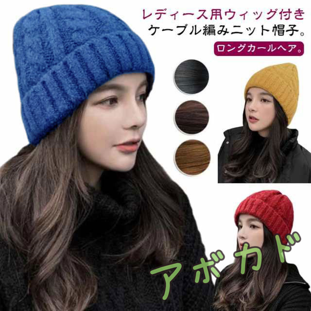 毛付き帽子 ウィッグ 付き 帽子 帽子付きウィッグ ウィッグ付き帽子 髪付き帽子 レディース ニット帽 ウィッグ付き ニットキャップ ケーブル編み 医療用帽子 医療用ウィッグ 小顔効果 自然 ロング カール ウェーブ 秋 冬 人工毛