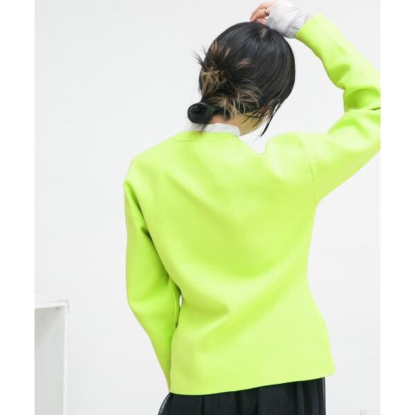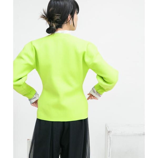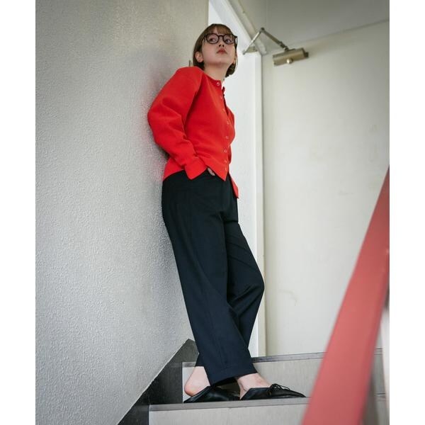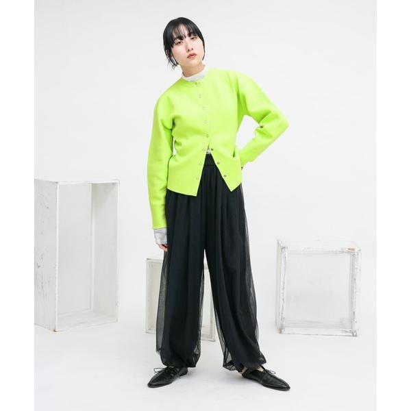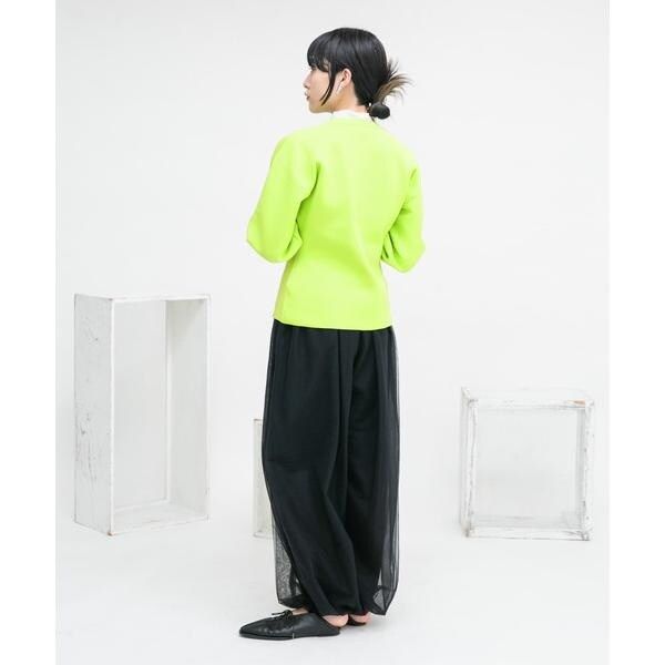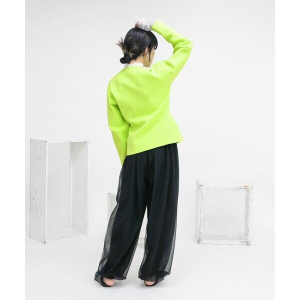 パンツ、スカートのどちらにも合わせやすい着丈になっています。ワイドシルエットのボトムを合わせると双方のデザインが引き立つので、ぜひお試しください。