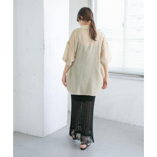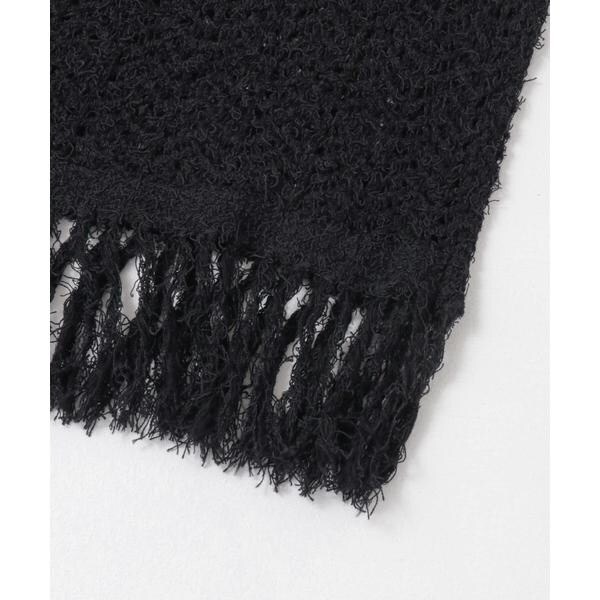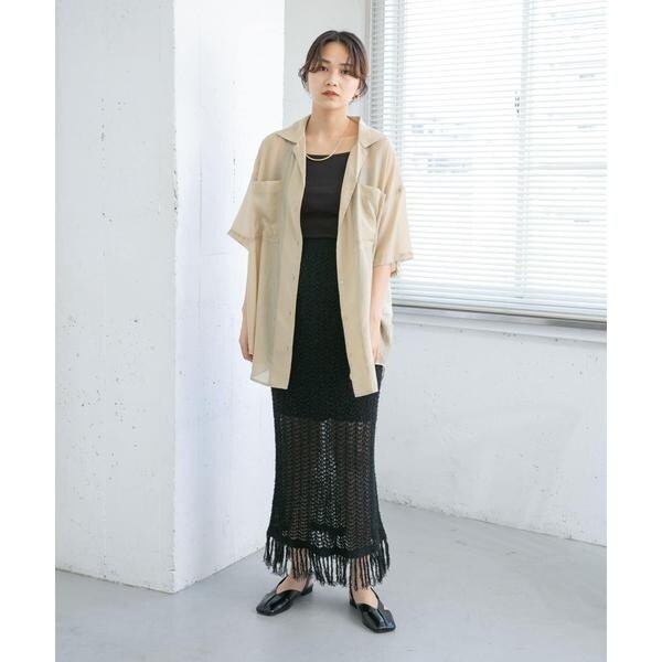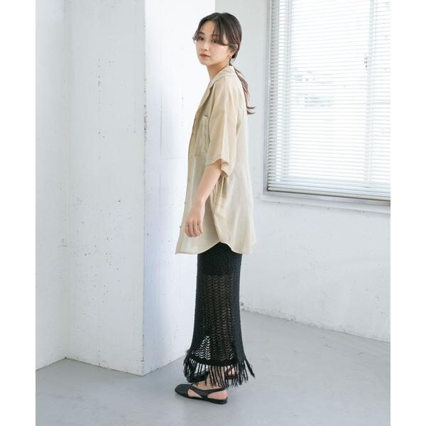 表面感のあるカールヤーンで仕上げた透かし編みのニットスカート。裾のフリンジでアクセントを添えています。膝上までの裏地付きで、透け感が気にならず涼しく着用いただけるのも嬉しいポイント。コーディネートに取り入れやすいベーシックな3色展開にも注目です。