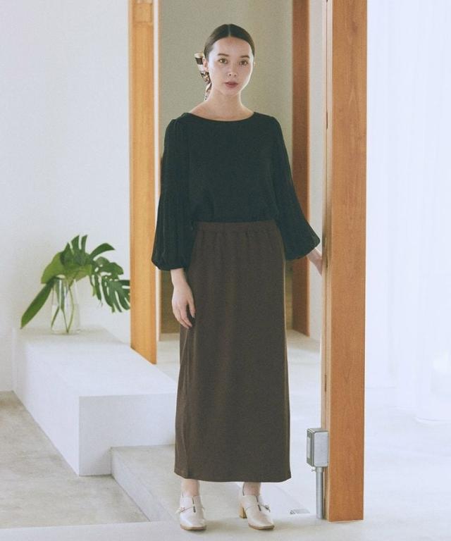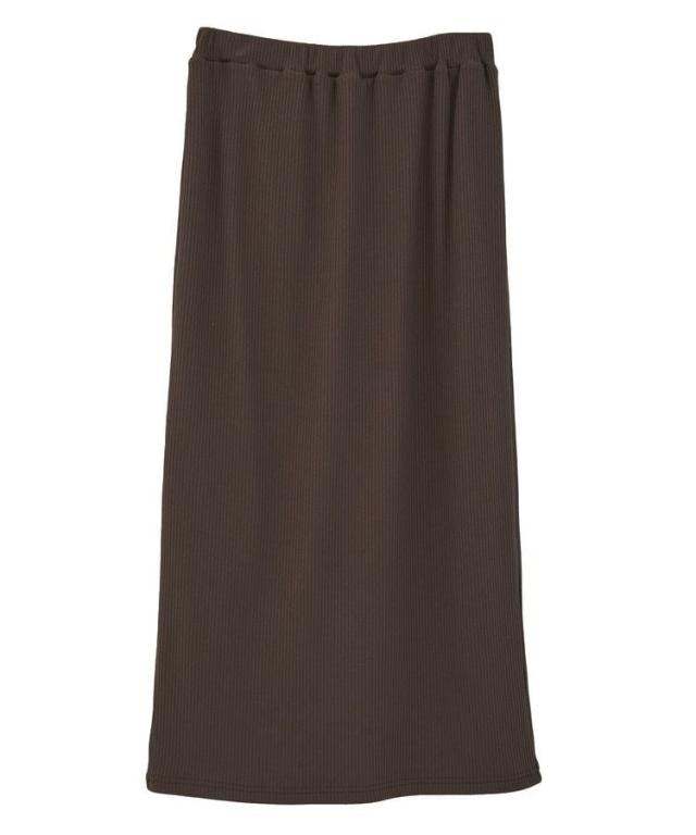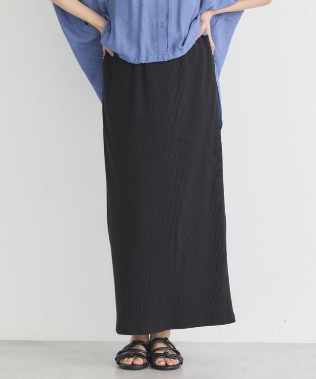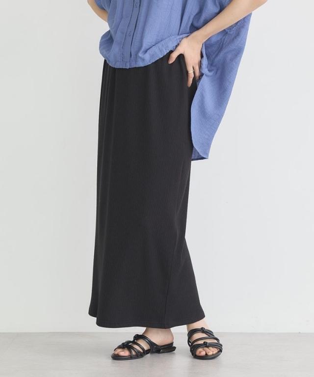 コットン混の優しい肌触りでさらりと着用いただけるデザインスカート。カットリブを使用した縦に流れるナローシルエットがすっきりとしたスタイリングを後押しします。ウエストも総ゴム仕様でフィット感よく、タックインスタイルにもマッチ。バックスリット入で足さばきしやすいストレッチ性に優れた快適な穿き心地なのも魅力です。透け感[ややあり]