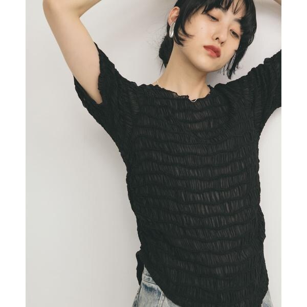 シアー素材にウェーブのような柄がシャーリングされた華やかなトップス。コンパクトなサイジングなのでメイン使いのみならず、インナーとしても活躍します。袖と脇にもシャーリングを施しているので、ベーシックコーデにプラスするだけで映えます。合わせやすいIVORYとBKACK、夏らしいORANGEをご用意しております。