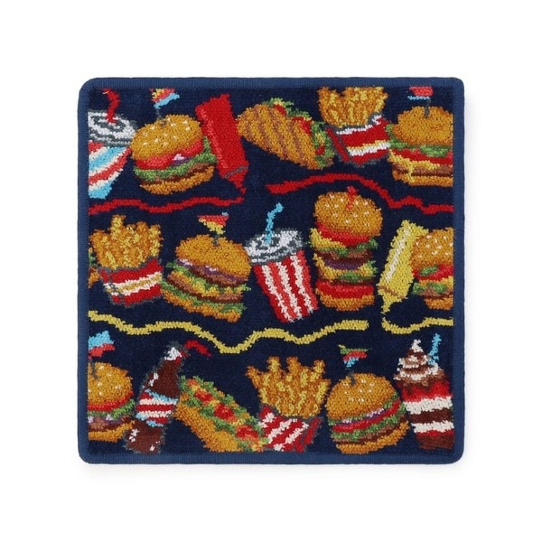ボリューミーなハンバーガーが並んだ『バーガーショップ』のハンカチです。たっぷりのケチャップとマスタードを追加して、お好みの味を楽しむのも楽しそう。もちろんセットのドリンクやフライドポテトも付いています。思わずお腹がすいてきそうな、食いしん坊にぴったりの一枚です。バーガー好きな友人へのプレゼントにいかがでしょうか。