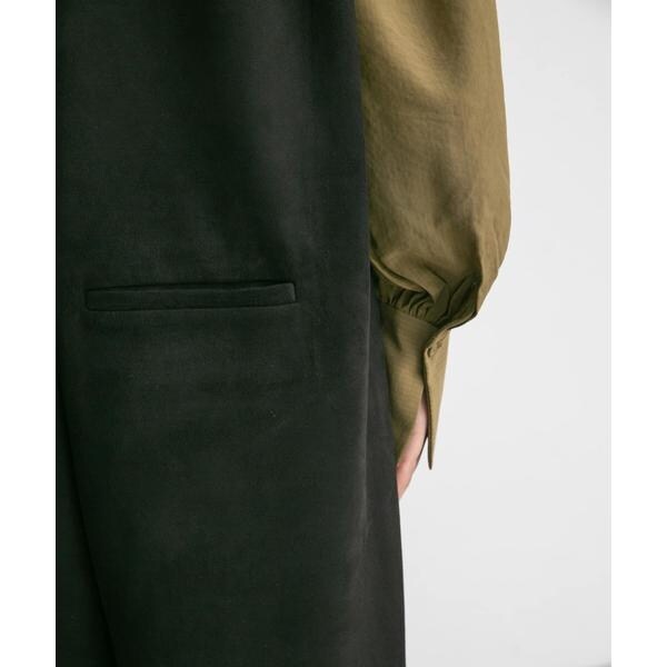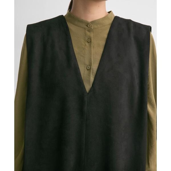 首回りが開いているのでハイネックシャツやタートルニットを合わせるとバランス良く仕上がります。ボリュームスリーブブラウスとも相性抜群。足元はローファーやヒールのあるブーツでマニッシュにして頂くのがイチオシです。