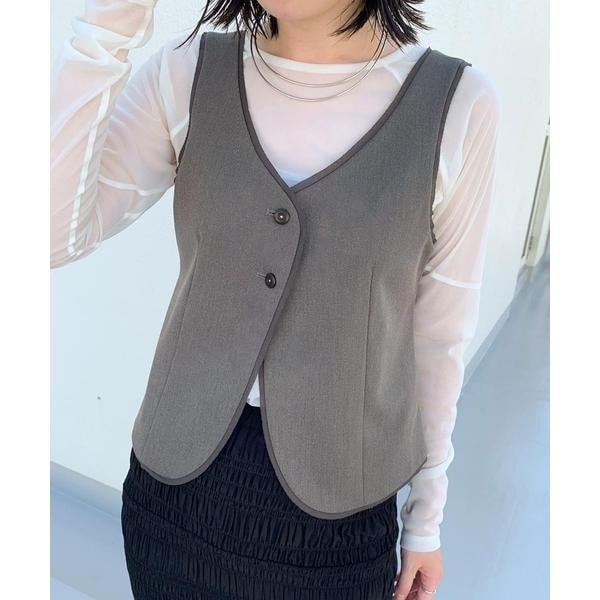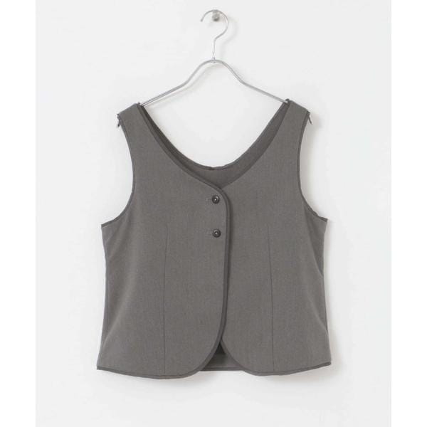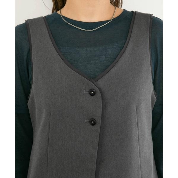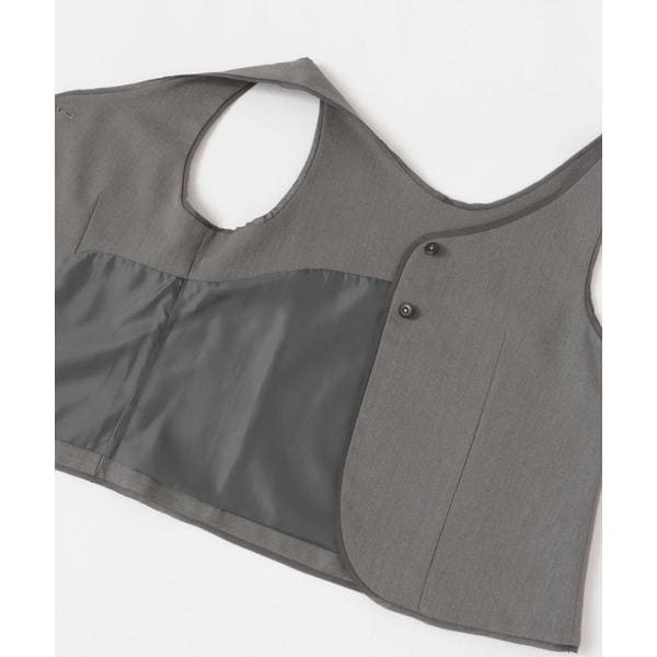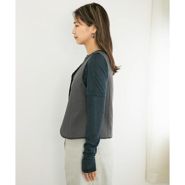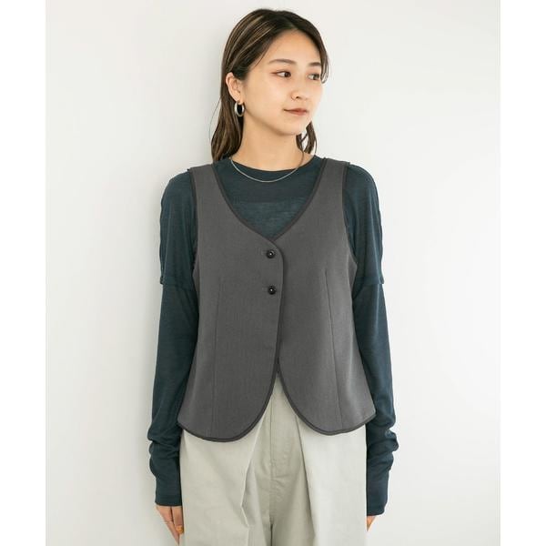 引き続きワードローブに欠かせないプラスワンアイテム”ベスト”。ネックやウエストラインをレディライクなデザインにし、釦も少しレトロ風に仕上げました。ポリエステルレーヨンを採用したことで、比較的シワになりにくい素材なのもポイント。