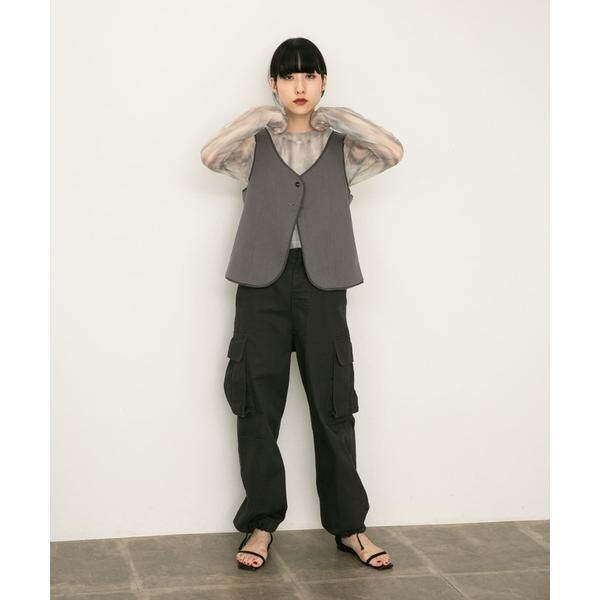 暑い時期はスリーブレスのトップスを合わせるのがおすすめ!透け感のあるトップスやぴったりとしたアイテムと好相性。すっきりとしたボトムを穿くときれいめに纏まります◎