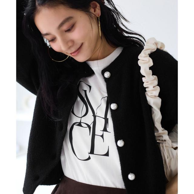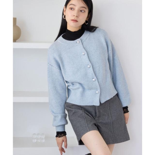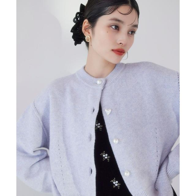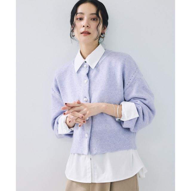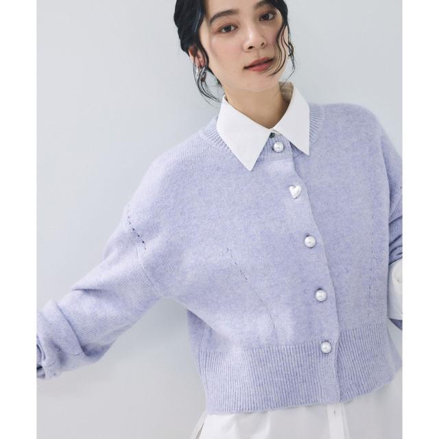 着心地のよさ、着まわしやすさ、長く着られるシルエットにこだわっています。トップス使いと羽織り両方に使える着丈でボトムを選ばないサイズ感。袖口のリブでたくし上げられるので抜け感を出すこともできます。フロントはパール調釦で、第二釦はぷっくりハート形に。※ブラック(01),ブルー(44)のボタンは全て丸パール仕様となります。