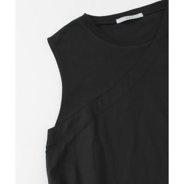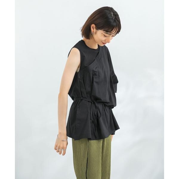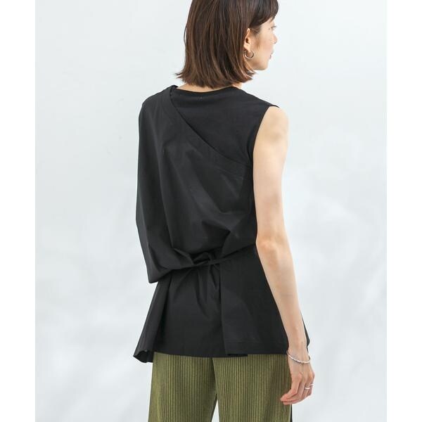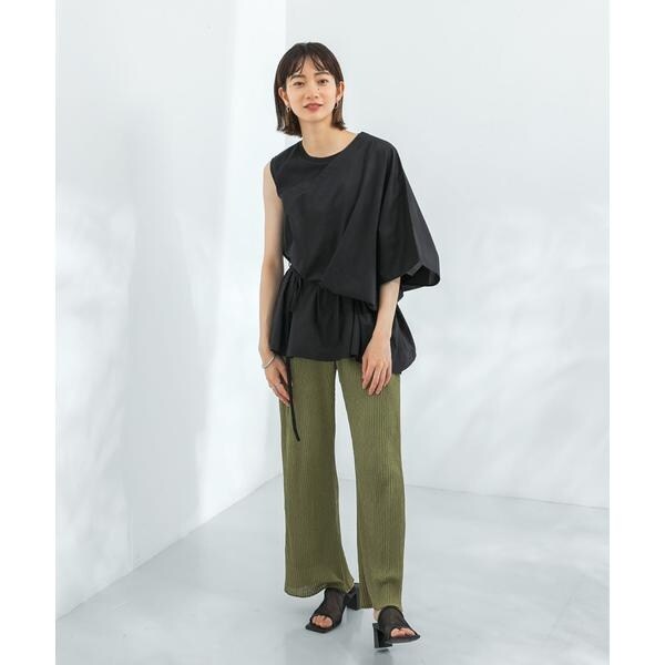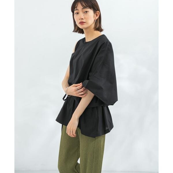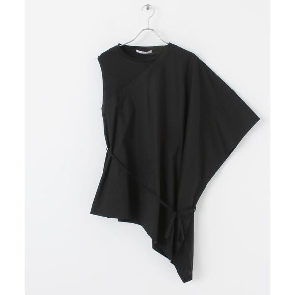 アシンメトリーにマントのようなパーツがドッキングされたエッジの効いたブラウス。首周りはカットソー素材になっているのでかっちりしすぎずカジュアルアイテムとも好相性。ウエストマークしたシルエットは女性らしく、リボンを外してふわっと着ていただくのもおすすめです。