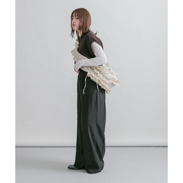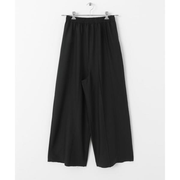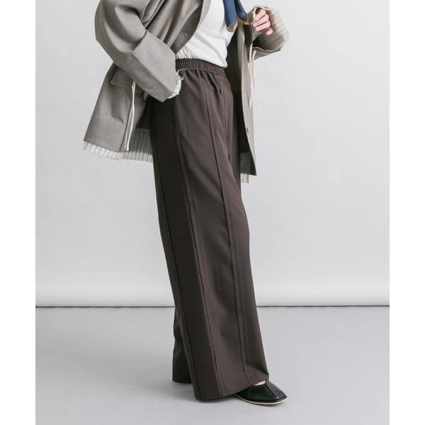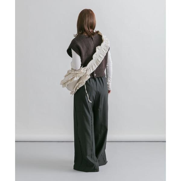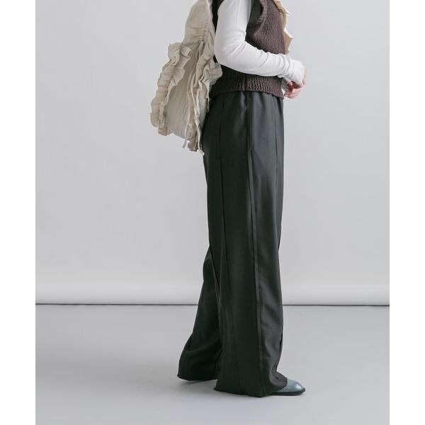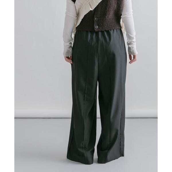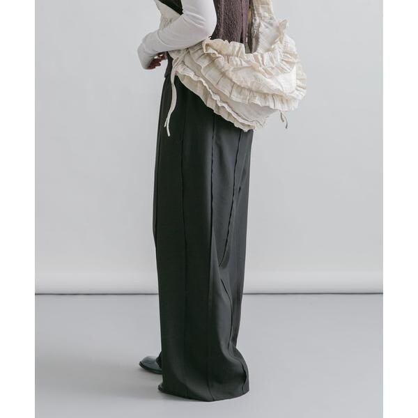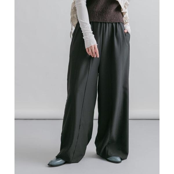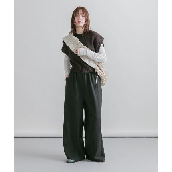 ウエストぐるりゴム仕様で、リラクシーな履き心地が期待できるパンツ。一見ベーシックに見えますが、切替部分を断ち切り仕様に仕上げました。ワイドシルエットでメンズっぽさも演出してます。合わせるアイテム次第でロングスパン活躍する1本です。