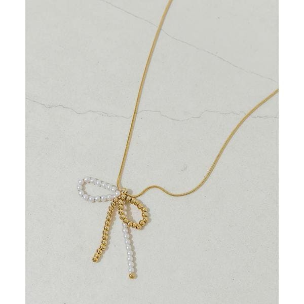パール×メタルボールのビーズでリボンモチーフに仕立てた動きのあるルックスが魅力のネックレス。
