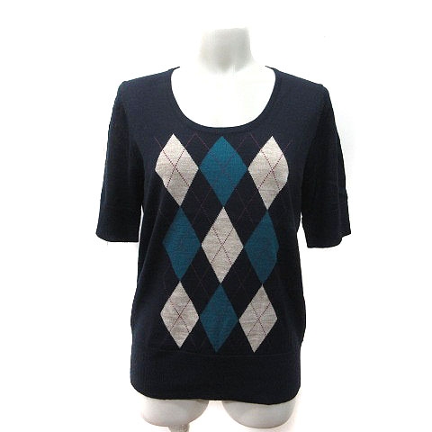 【中古】コムサイズム ニット カットソー Uネック アーガイル 五分袖 L 濃紺 ライトベージュ 青 紫 レディース
