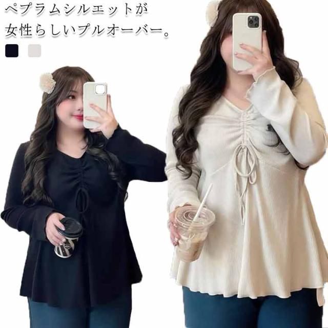 ペプラムトップス トップス レディース カットソー プルオーバー Tシャツ 長袖 フリル袖 vネック ギャザー リボン ペプラム 裾フレア 体型カバー シンプル きれいめ オケージョン セレモニー ブラック ベージュ