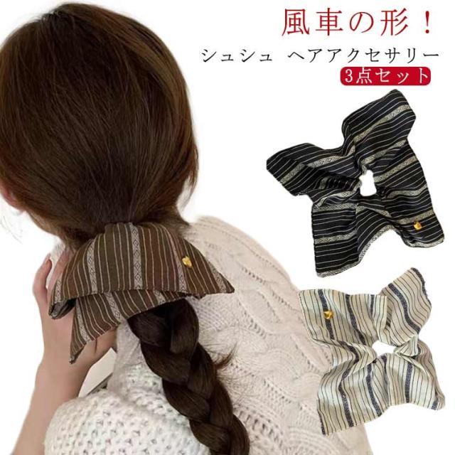 韓国 大人気 3点セット ヘアゴム 韓国ファッション かわいい シュシュ 大きい シュシュ スクエア 四角 ストラップ 風車の形 ブランド フリル ヘアアクセサリー 髪に優しい きれいめ プレゼント ギフト