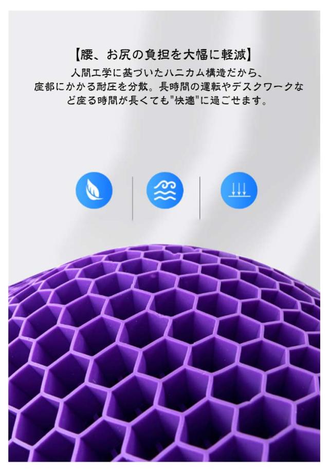 | 低反発ゲルクッション お尻が痛くならない カバー付き 【腰、お尻の負担を大幅に軽減】人間工学に基づいたハニカム構造だから、座部にかかる耐圧を分散。長時間の運転やデスクワークなど座る時間が長くても"快適"に過ごせます。 【へたらず、長持ち】耐久性、弾力性の高い素材で、へたりにくく長持ち!買い替え頻度が減り、とても経済的! 【様々な人たちに適用】1点2役!椅子に置くだけでなく、座布団としてフローリングなどの硬い床に敷いて使えます。高齢者、運転者、産後のママさん、オンライン授業する子供、サラリーマン、受験生、釣りの好みな方にオススメ。家族、友人、上司にの祝日・誕生日のプレゼント、母の日、父の日、敬老の日のプレゼントとしてもオススメ。 【丸洗いできていつでも清潔】使用していくにつれて汗や汚れが気になってもクッション本体は丸洗いができるので"いつでも清潔"に保てます。カバーは取り外して洗濯でき、清潔にご使用いただきます。 | |